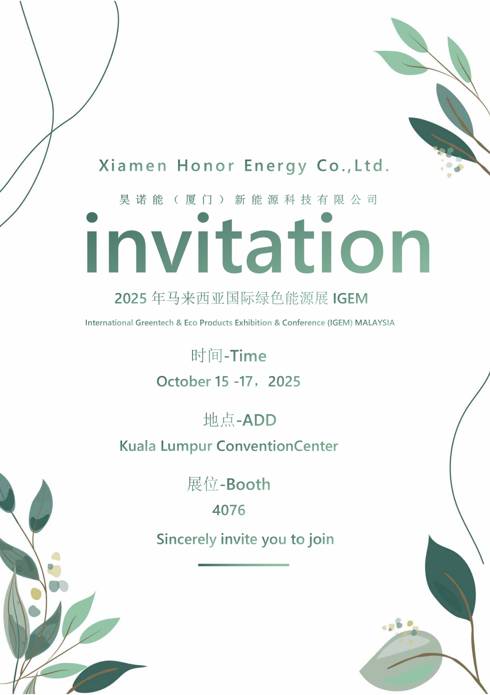 हामीखुशी छन्2025 मलेसिया अन्तर्राष्ट्रिय हरित ऊर्जा प्रदर्शनी (IGEM) को लागि हाम्रो आधिकारिक निमन्त्रणा घोषणा गर्न।